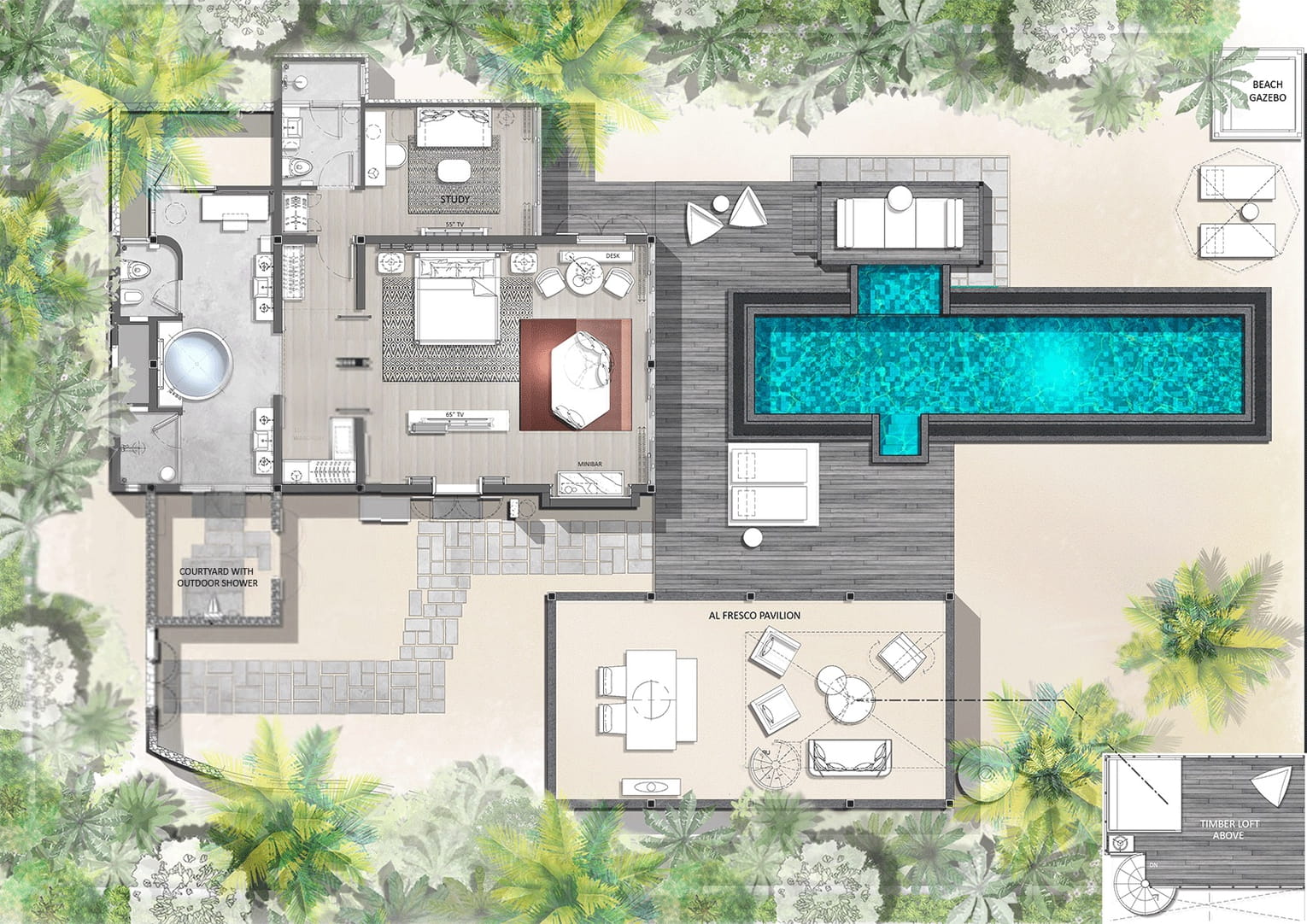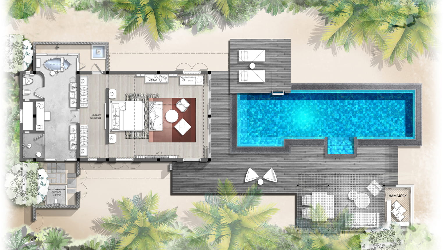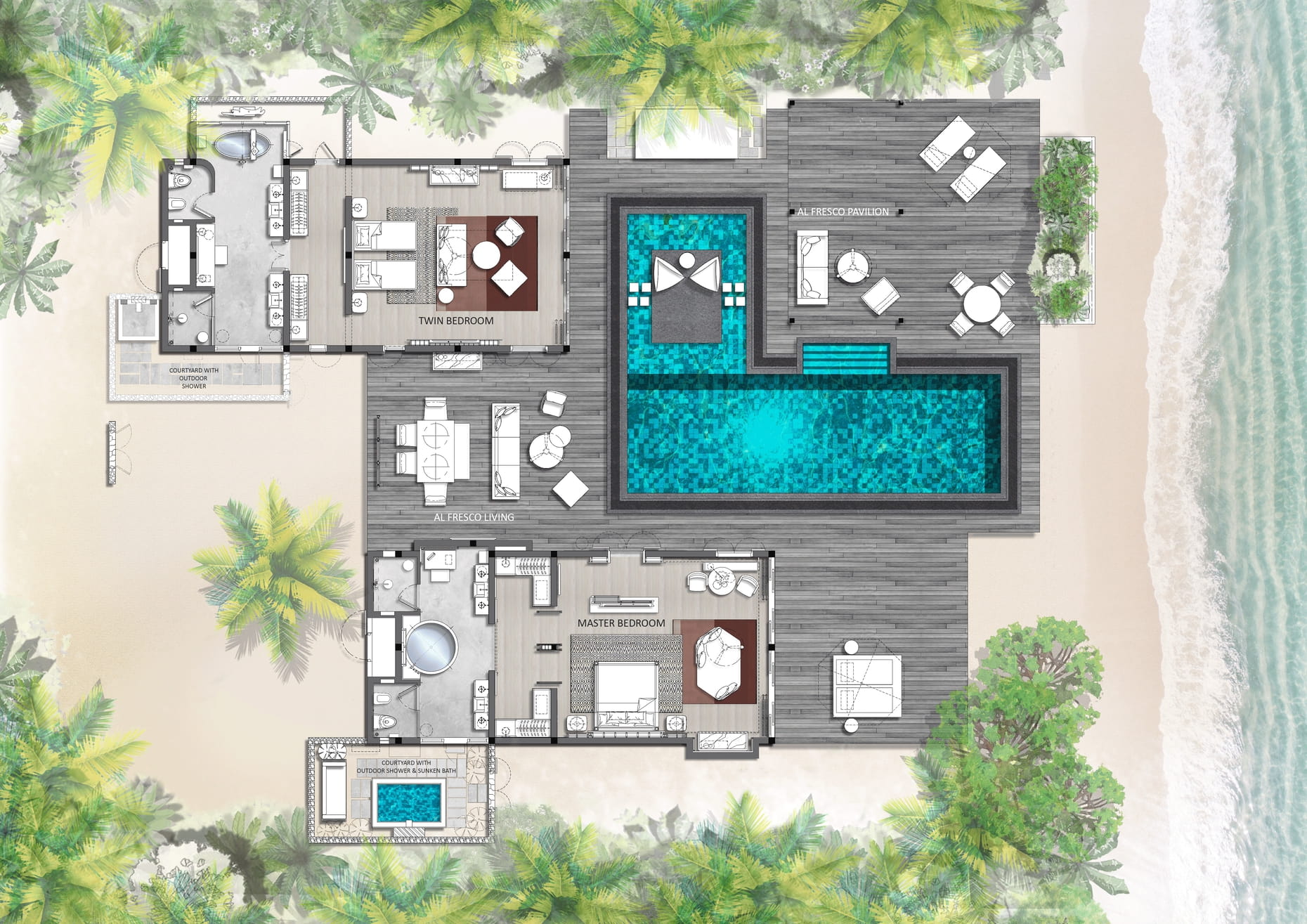 Площадь номера — 77 кв.м + 91 кв.м открытого пространства. Бунгало с бассейном на берегу океана в северной части острова. Состоят из спальни с большой двуспальной кроватью или двумя односпальными кроватями; зоны отдыха с диваном-кроватью; гардеробной; ванной комнаты с ванной, крытым и открытым душами; террасы с бассейном, обеденным павильоном, лежаками, гамаком и выходом на пляж.