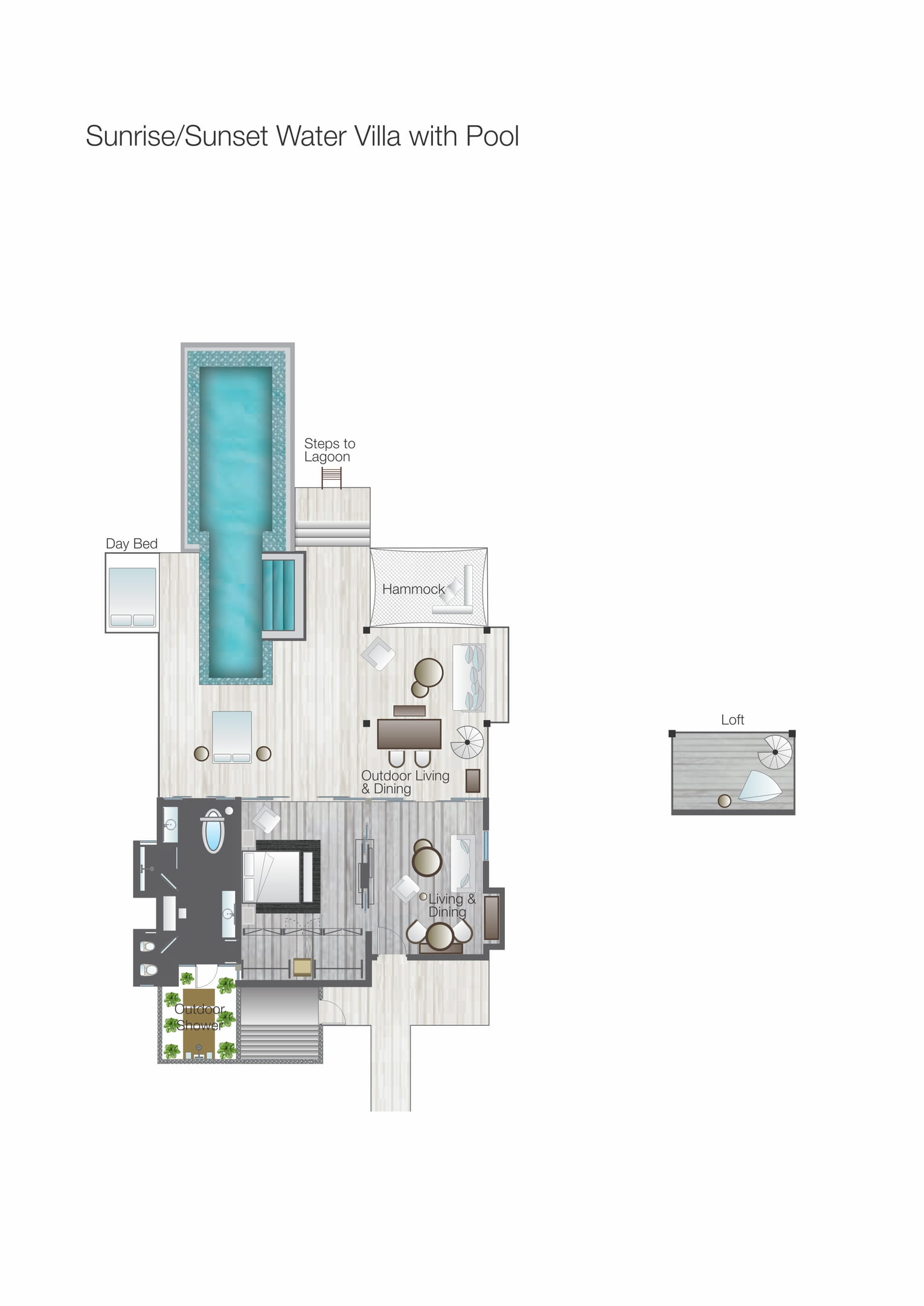 Площадь номера — 90 кв.м + 183 кв.м открытой площади. Водные виллы с бассейном и видом на рассвет, расположены в северо-западной части острова. Состоят из спальни с большой двуспальной кроватью или двумя раздельными кроватями; гостиной зоны с диваном-кроватью; ванной комнаты с ванной, крытым и открытым душами; террасы с бассейном, лежаками, обеденным павильоном, гамаком и спуском в воду.