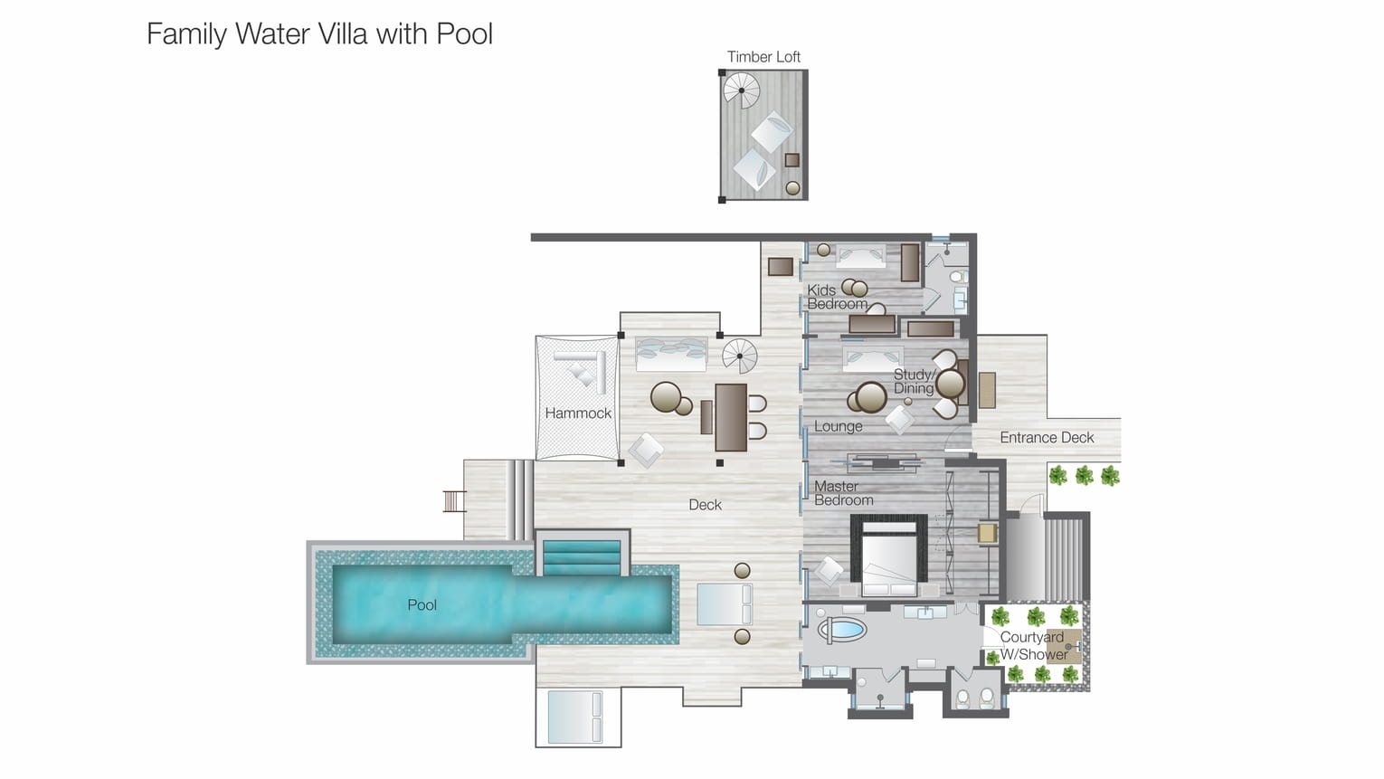 Площадь номера — 99 кв.м + 91 кв.м открытого пространства. Семейные бунгало с бассейном на берегу океана. Состоят из спальни с большой двуспальной кроватью; зоны отдыха с диваном-кроватью; гардеробной; ванной комнаты с ванной, крытым и открытым душами; кабинета с раздвижным диваном и второй ванной комнатой; террасы с бассейном, обеденным павильоном, лежаками, подвесными качелями и гамаком.